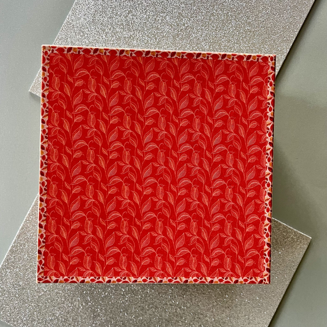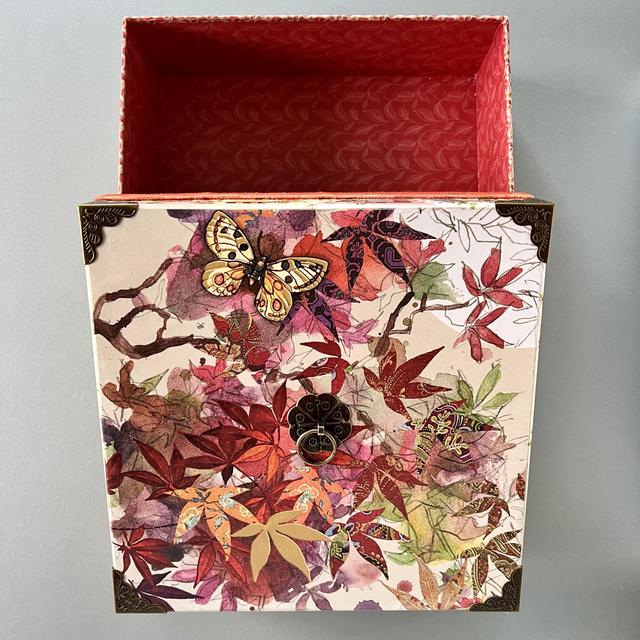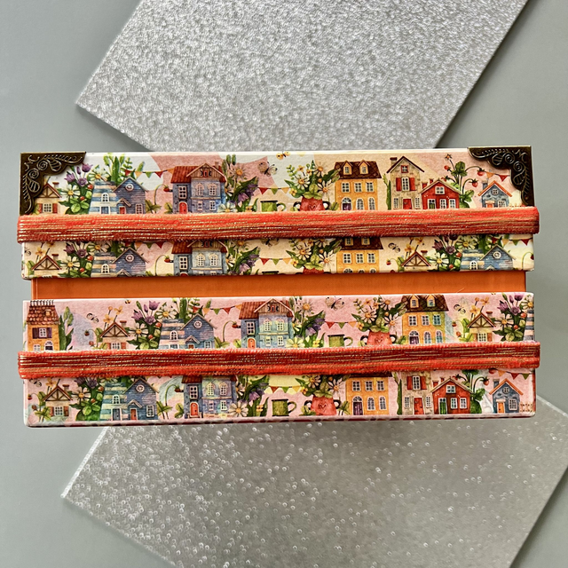 Deux boîtes de grande marque et de belle qualité, ainsi qu'une illustration de calendrier expiré, ont été choisies avec inspiration pour réaliser ce coffret. Les côtés sont recouverts de ruban adhésif orné des petites maisons cosy et deux liserés de velours camaïeu d'orange font le tour. Les angles externes du couvercle ont été renforcés à l'aide de coins décoratifs en métal. Sur le dessus, au centre, une petite poignée d’ornement est disposée. L'intérieur de la boite est recouvert de papier décoré de petites feuilles . Une couche vitrificatrice satinée recouvre et protège l'ensemble.